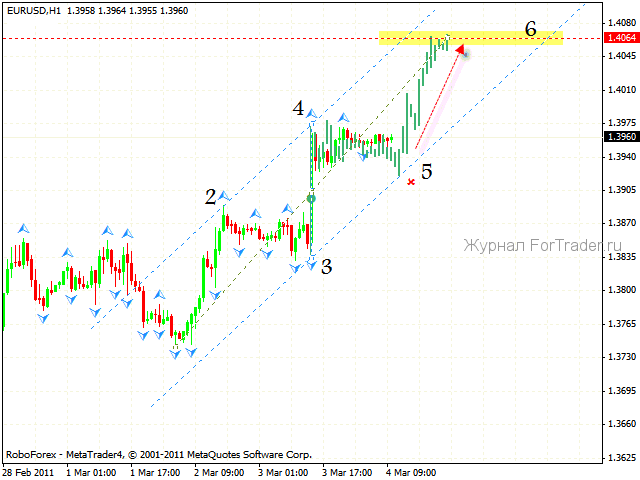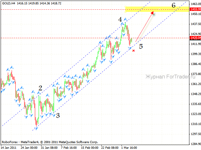 Золото продолжает движение в рамках прогноза форекс опубликованного 26.01.2011. На текущий момент целью роста пары выступает область 1455. Можно пробовать покупки финансового инструмента со стопом ниже 1407. Отменой же варианта станет пробитие нижней границы канала.