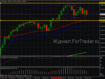 Подведём итоги прошлого обзора от 13 мая 2011 года. И сделаем анализ характера движения котировок ведущих индексов, который продемонстрировал фондовый рынок США. Мы говорили: “Таким образом, котировки индекса Dow Jones industrial Average находятся в ценовом коридоре со следующими границами: верхняя -12875, нижняя – 12450. Пробитие одной из них укажет дальнейшее направление движения”. В пятницу 13 мая 2011 года котировки индекса Dow Jones industrial Average демонстрировали отрицательную динамику. Обратимся к дневному временному интервалу. На графике показаны два канала синего цвета, построенных по трём фракталам. Восходящий канал построен по двум нижним фракталам и одному верхнему фракталу. Нисходящий канал построен по двум верхним и одному нижнему фракталу. Границы этих же каналов образуют графическую фигуру треугольника: верхняя граница нисходящего канала – верхняя граница треугольника, нижняя граница восходящего канала – нижняя граница треугольника. С второго мая 2011 года наблюдается снижение амлитуды колебания цен. Фондовый рынок США находится в неопределённом состоянии уже довольно продолжительное время. На пути движения вверх имеются два сопротивления в виде верхней границы треугольника и верхней границы бокового движения, которое находится на отметке 12875. На пути движения вниз имеются два сопротивления в виде нижней границы треугольника и нижней границы бокового движения, которое находится на отметке 12450. Кроме указанных сопротивлений, на пути нисходящего движения имеются ещё два сильных сопротивления. Это средняя скользящая красного цвета с периодом 60 и средняя скользящая синего цвета с периодом 90. Необходимо отметить, что индикаторы MACD и Stochastic Oscillator указывают на перекупленность индекса Dow Jones industrial Average. Поэтому в ближайшей перспективе стоит ожидать пробития нижней границы треугольника.