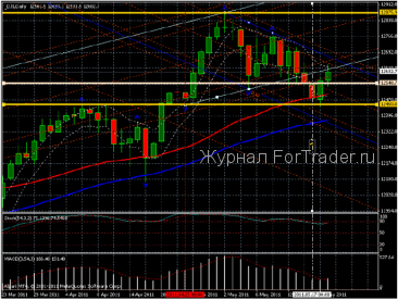 Подведём итоги прошлого обзора от 16 мая 2011 года. И сделаем анализ характера движения котировок ведущих индексов, который продемонстрировал фондовый рынок США. Мы говорили: “ Таким образом, в ближайшее время мы ожидаем нисходящее движение, которое продемонстрирует фондовый рынок США. Первой целью такого движения является отметка 12432. Второй целью данного движения является отметка 12368.” Первая цель достигнута. Проходящая неделя внесла свои корректировки и вторая цель отметилась на уровне 12378. Ранее мы указывали значение 12368. В прошлом обзоре мы указали формирование графической фигуры треугольник. Нижняя граница треугольника была пробита 16 мая 2011 года. Котировки индекса Dow Jones industrial Average устремились вниз. Закрытие свечи от16 мая 2011 года произошло ниже нижней границы треугольника. Однако для подтверждения нисходящего движения необходимо закрытие второй дневной свечи ниже указанной границы треугольника. Дневная свеча от 17 мая 2011 года закрылась ниже нижней границы треугольника и ниже предыдущего закрытия. Но дневная свеча от 17 мая имеет длинную тень вниз, что указывает на нежелание продолжить движение вниз. Кроме того, длинная тень образовалась вблизи средней скользящей 60 Moving Average. Закрытие свечи от 17 мая 2011 года происходит выше средней скользящей с периодом 60. Данное обстоятельство указывает на наличие серьёзного сопротивления на данном уровне. В дальнейшем мы наблюдаем отскок вверх от средней скользящей 60 Moving Average. 18 мая дневная свеча имеет зелёный окрас и закрывается выше уровня средней скользящей 60 Moving Average. Дневная свеча от 19 мая 2011 года открывается выше средней скользящей красного цвета. Если закрытие данной свечи пройдёт выше закрытия предпоследней свечи, то оскок подтвердит свои намерения. Обратим внимание на канал белого цвета. Верхняя граница канала состоит из средней скользящей с периодом 12 и параметром закрытия High. Нижняя граница состоит из средней скользящей с периодом 12 и параметром закрытия LOW. 4 мая 2011 года котировки индекса Dow Jones industrial Average вернулись в указанный канал белого цвета. Дневная свеча от 5 мая 2011 года закрылась ниже нижней границы белого канала. Данное закрытие является сигналом для потенциального нисходящего движения. Необходимо подтверждение сформировавшегося движения. Но дневная свеча от 6 мая 2011 года закрывается выше значения закрытия предпоследней свечи. Закрытие происходит на границе нижней границы белого канала. 7 мая 2011 года дневная свеча вернулась в канал белого цвета, котировки индекса не оправдали своего намерения в нисходящем движении. В дальнейшем мы наблюдаем преимущественно боковое движение внутри канала белого цвета. 17 мая 2011 года котировки индекса вновь вышли за пределы нижней границы белого канала. 18 мая 2011 года данное намерение не оправдалось. И цена вновь вернулась в рамки канала белого цвета. Дальнейшее движение котировок индекса мы также будем анализировать по характеру движения относительно белого канала. На данный момент руководствуясь указанным анализом, направленность движения определить сложно.