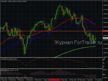 Подведём итоги прошлого обзора от 17 июня 2011 года. Мы говорили:” Первого июня 2011 года котировки индекса пробили нижнюю границу белого канала и продолжили своё движение вне границ указанного канала белого цвета. Данное движение сформировало достаточный потенциал для того, чтобы пробить среднюю скользящую 200 MA. Таким образом, на основании вышесказанного, мы ожидаем движение котировок индекса в район 12300 пп”. В пятницу индекс Dow Jones industrial Average показал положительную динамику. Котировки остановились на уровне 12004,3 пп. Обратимся к 4-х часовому временному интервалу. Рассмотрим канал белого цвета. Верхняя граница белого канала состоит из средней скользящей с периодом 12 и параметром закрытия High. Нижняя граница состоит из средней скользящей с периодом 12 и параметром закрытия LOW. 17 июня 2011 года цены оттолкнулись от нижней границы канала белого цвета. 4-х часовая свеча от 16 ч 00 м попыталась в своём движении пробить верхнюю границу ценового канала белого цвета. Однако закрыться выше верхней границы белого канала и закрепиться на этом уровне котировкам индекса не удалось. 4-х часовая свеча закрылась внутри белого канала. Последующая свеча также не смогла пробить верхнюю границу указанного канала. Если мы обратим внимание на дневной временной интервал, то увидим, что котировки также пытались пробить верхнюю границу белого канала.