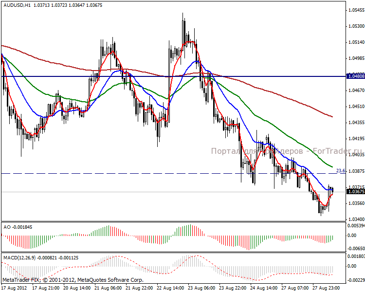 На часовом графике видим локальное снижение, тенденция достаточно прочная и средние указывают на длительное снижение. В краткосрочной перспективе на сегодня актуальны короткие позиции, следующая цель 1.03025 пунктов.
