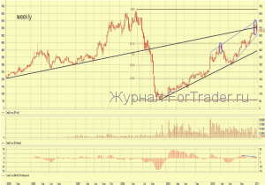 Начавшаяся коррекция привела к формированию сильной разворотной формации на недельном тайм-фрейме – “падающая звезда”, подтвержденная объемами. Подобный сигнал стал предвестником 30% коррекции весной 2010 г.