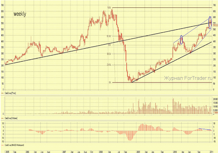 На первой торговой неделе 2011 г. котировки акций Северстали совершили попытку вернуться в долгосрочный восходящий тренд (рис. — черный), берущий начало с середины 2005 г. Преградой для движения котировок стало сильное сопротивление в районе 600-605 р., где также проходит верхняя граница восходящего клина (рис. — синий).