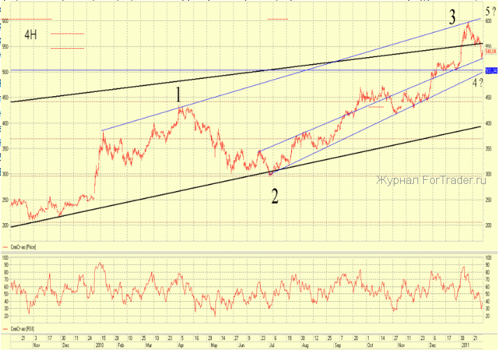 Рассмотрим локальную картину, представленную 4-часовым графиком. Вчера 31-го января цена нашла поддержку в районе 525 р. и начала коррекционный отскок, закрыв утренний гэп. Краткосрочно котировки зажаты между уровнями 525 р. и 555 р. В силу долгосрочности сопротивления более вероятен выход вниз.