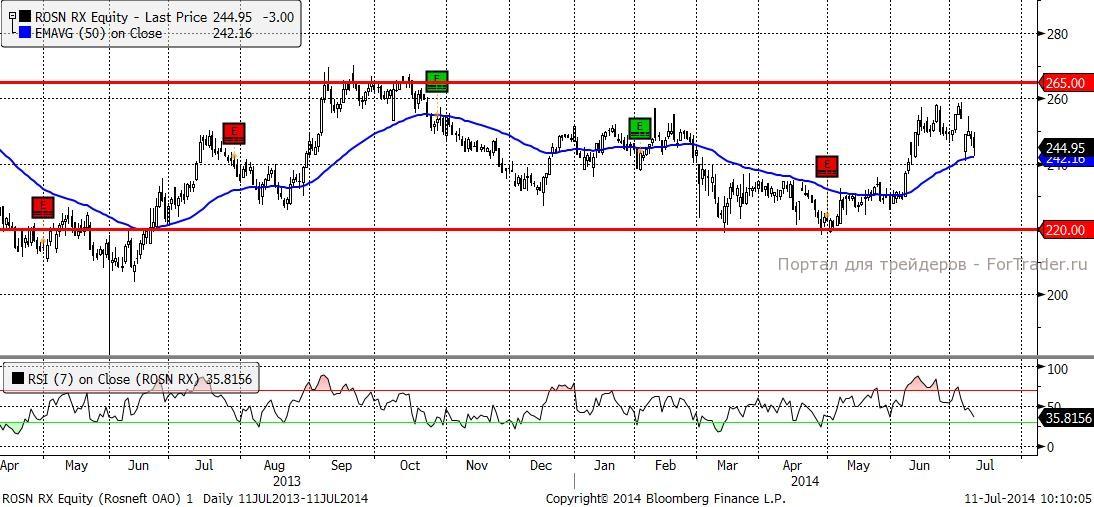 На наш взгляд, опасения инвесторов, связанные с потенциальным введением санкций против сырьевой отрасли России, преувеличены. Западный бизнес явно не согласен с такими предложениями. Поэтому мы полагаем, что приобретение российских бумаг нефтяного сектора является хорошей долгосрочной идеей. Покупать бумаги Роснефти имеет смысл с уровня в 220 рублей.