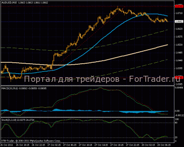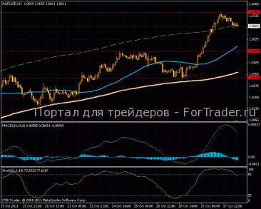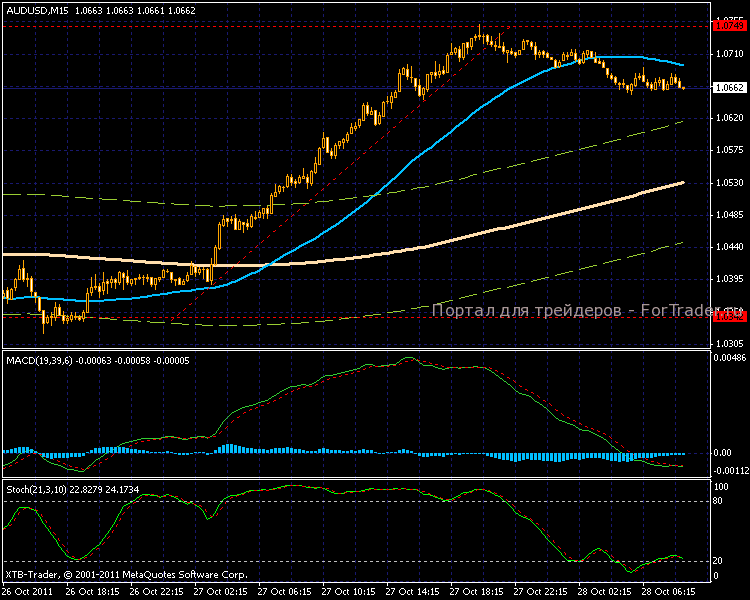На 15-ти минутном графике значительное усиление восходящей тенденции, кроме цены верхнюю границу канала пробила и более быстрая МА. Индикатор MACD уже успел зайти в отрицательную зону. Наиболее вероятным сценарием развития торгов будет коррекция.