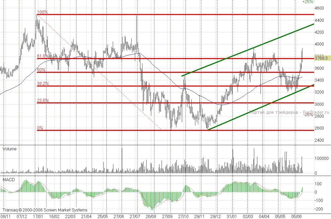 Позитивный тренд на этом графике развивается с декабря 2011 года, сейчас движение потихоньку приобретает очертания канала. А значит, мы получаем цель бумаг в районе линии сопротивления 4300-4350 рублей. Важная поддержка видна на уровне 3755 рубля (линия коррекции по Фибоначчи к падению бумаг с января по ноябрь 2011 года). Купив бумаги в районе 3800 рублей, вы получаете возможность заработать более 12,5%, а риски заложить, как вам захочется 3-4%. Такое соотношение риска и доходности на нашем рынке сейчас не редкость. Но картинка, не приплюснутая нисходящим трендом от марта 2012 года, останавливает взгляд. Тем более, что цель по «Магниту» будет ежедневно тянуться вверх.