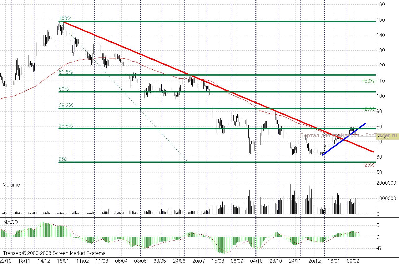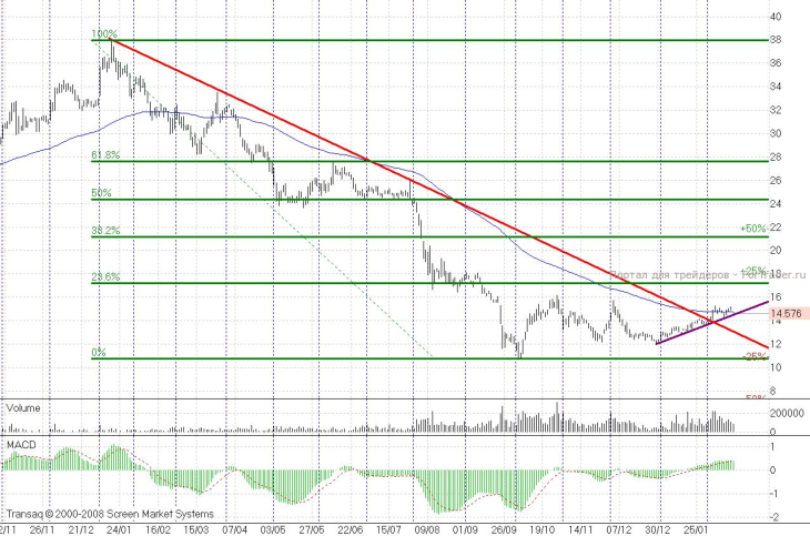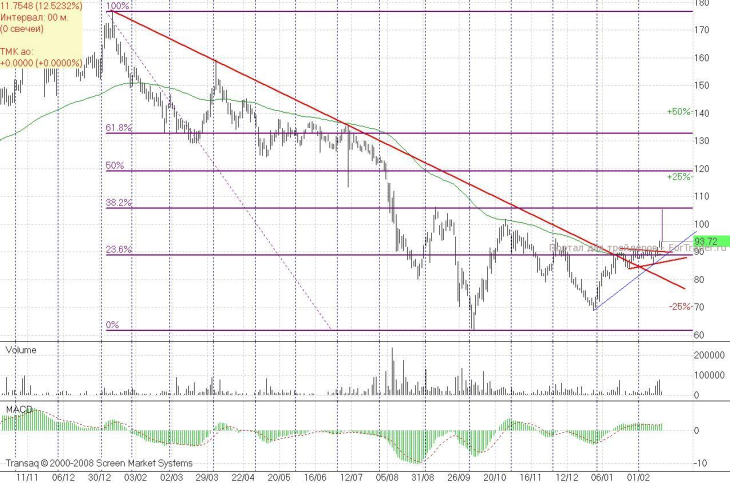 Бумаги «ТМК» — единственные из представленных акций в период с октября 2011 года по текущий момент сумели захватить линию коррекции по Фибоначчи 23,6% к прошлогоднему падению и превратить её в сильную поддержку.