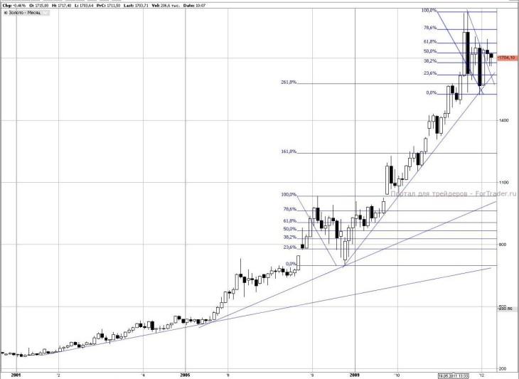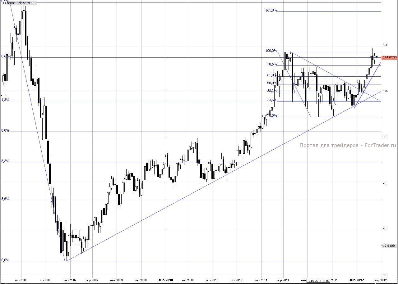 На графике нефти марки Brent, на первый взгляд, примитивная картинка – пик прошлого года не пускает котировки наверх. Но все несколько сложнее. На самом деле котировки контракта испугались не только сопротивления максимума 2011 года. На отметке 124,5 доллара за баррель лежит линия коррекции по Фибоначчи 78,6% к кризисному падению. Мы уже прошли очень серьезный рубеж Фибо 61,8% (105,5 долларов), открывающий путь не только к историческим верхам нефти, но и к линии Фибо 161,8% (220 долларов за баррель). Такие рубежи не берутся с налета и у уровня Фибо 78,6% есть шанс показать разворотную силу. В глобальном плане есть серьезные шансы на поход к историческим максимумам в этом году, даже если котировки скатятся в район 110 долларов (восходящий тренд 2008 года и линия коррекции по Фибоначчи 38,2% к прошлогоднему падению). Даже недолгое возвращение в район 105,5 долларов не будет критическим.