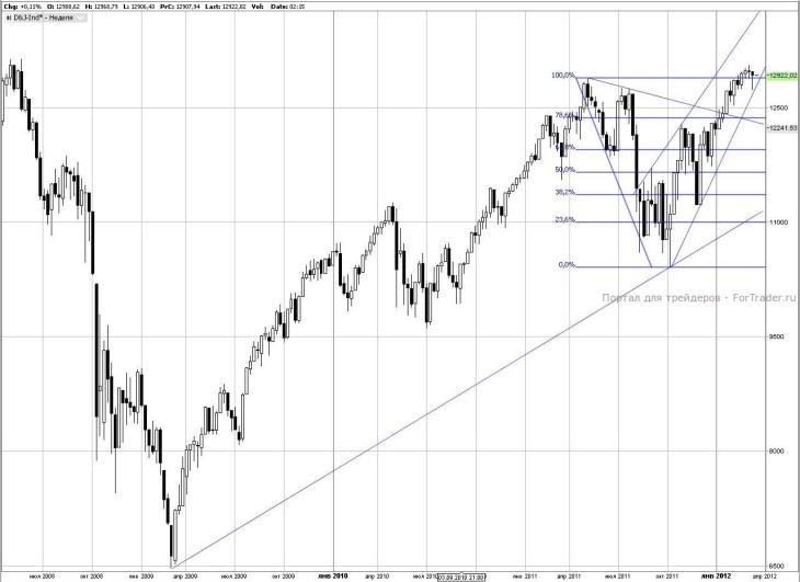 На графике индекса Dow Jones важнейшее изменение произошло после закрепления индикатора за пиком 2011 года. Теперь на графике индекса можно рисовать новую ипостась растущего движения 2008 года. Новая глобальная поддержка лежит на уровне 11200 пунктов, и я полагаю, что в этом году котировки индикатора в случае развития серьезного негатива мы не увидим значительно ниже. Второй важный момент — 12900 упрочнился в качестве поддержки, теперь он обусловлен не только пиком прошлого года, но и подтянувшимся в этот район восходящим трендом от октября 2011 года. Расти индексу, который в 10% от исторических максимумов, очень тяжело. Тем не менее, при сохранении локальных поддержек, я вижу открытую цель 13800 пунктов (сопротивление восходящего канала октября).