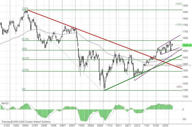 На графике индекса ММВБ бросающийся в глаза момент — это появившаяся расширяющаяся формация. Подобные формации предупреждают о возможном увеличении волатильности. Верхняя граница расширяющейся формации и индикатор MACD сформировали нечто похожее на тройную дивергенцию. Тут возможны резкие наступления «медведей» вплоть до уровня 1520 пунктов. Картинка на графике индекса ММВБ снова вернется на «бычью» сторону только после пробоя уровня 1630 пунктов (линия коррекции по Фибоначчи 61,8% к прошлогоднему падению).
