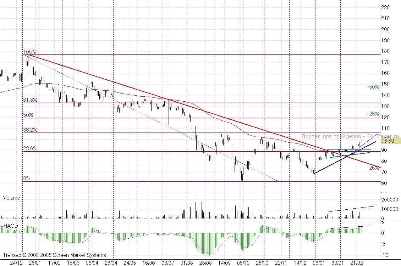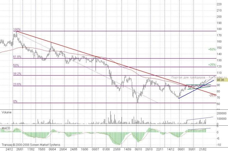 Я уверенна, что он там заявка простоит недолго. Думаю, что скоро все же можно будет перенести её под уровень 105 рублей. Если у вас нет такой уверенности, или вас пугает наметившаяся дивергенция на графике цены и объеме, а также на графике цены и индикаторе MACD, то можете поставить «стоп-профит» под отметкой 95 рублей (январский восходящий тренд и линия определяющая реализацию сигнала на продажу по дивергенции).