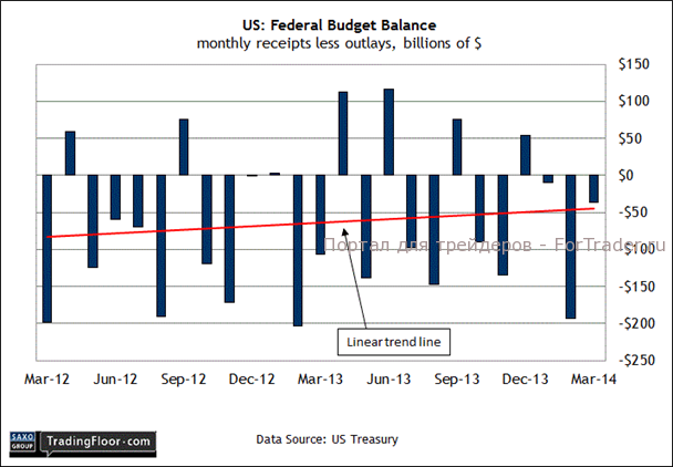 Возможно, из политизированных обсуждений в Вашингтоне это не так очевидно, но в налогово-бюджетной сфере наметилась благоприятная тенденция. Достаточно посмотреть на резюме самого последнего ежемесячного отчета о бюджете, подготовленного Бюджетным управлением Конгресса: «За первые семь месяцев финансового 2014 года дефицит бюджета федерального правительства составил 301 миллиард долларов, что на 187 миллиардов долларов меньше, чем было зафиксировано за аналогичный период прошлого года. Доходы выросли приблизительно на 8%, а расходы уменьшились на 3%». Доказательства небольшого уменьшения дефицита также проявляются в ежемесячных отчетах Министерства финансов.