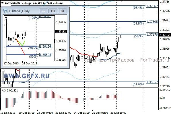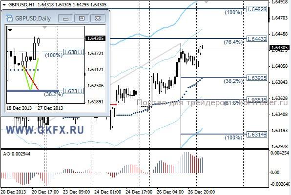 Пара GBPUSD продолжила рост, несмотря на низкие объемы на рынке. Вновь поступила заявка на закрытие недели выше 1,6420/50. Если сегодня рост пары продолжится, то это вполне выполнимо. В таком случае пара может открыть дорогу к 1,7000. Единственное, что вводит в сомнение, это то, что происходит все это в праздничные дни и доверять этому очень сложно. На этой неделе по традиции рассматриваю два варианта возможного движения цены, основной красный и альтернативный зеленый. Значимые уровни на сегодня отмечены на часовом графике. Индикатор АО находится в положительной зоне и снижается, указывая на коррекцию перед возможным продолжением роста. Индикатор тренда указывает на рост. Вне рынка.