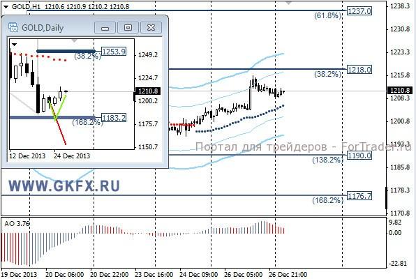Цены на золото неожиданно выросли на американских торгах, так как США вышли с праздников. Предполагалось, что Америка, несмотря на то, что работает, активных действий предприниматься не будет. Тем не менее, сегодня и другие страны выходят на работу и возможно кратковременное оживление рынка. Кратковременное потому что на следующей неделе уже новый год. Традиционно делаю два варианта движения цены на неделю, основной красный и альтернативный зеленый. Значимые уровни на сегодня отмечены на часовом графике. Индикатор АО находится в положительной зоне и снижается, указывая на коррекцию перед возможным продолжением роста. Индикатор тренда указывает на рост. Вне рынка.