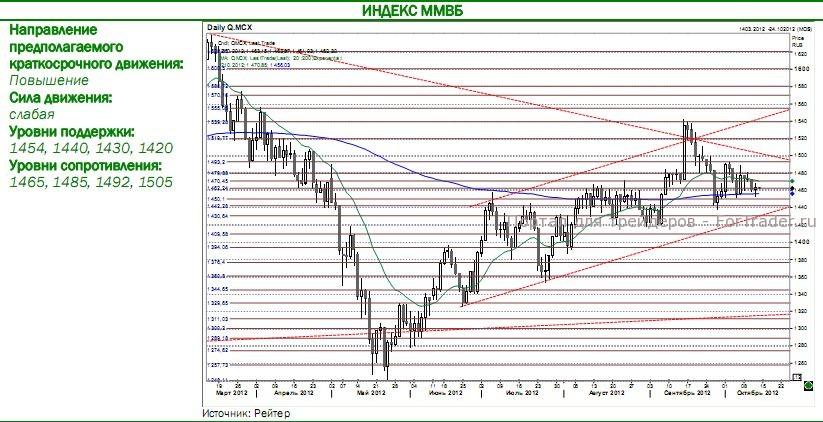 Торги на Московской бирже начнутся сегодня слабым снижением, однако вскоре эта тенденция, как и днем ранее, может смениться на  повышательную: помимо рисков улучшение настроений на рынках после отчетности банков и индекса Мичигана, диапазон 1445-1455  пунктов  по  индексу ММВБ выступает сильной зоной поддержки. Мы также не ждем роста волатильности в ближайшие день-два — важную роль в ее сдерживании может сыграть фактор экспирации опционов октябрьской серии на индекс — вероятно, что до вторника следующей недели рынок не сможет показать сильных однонаправленных движений.