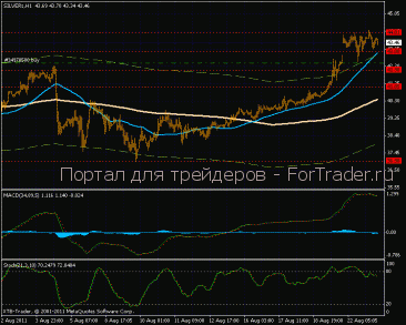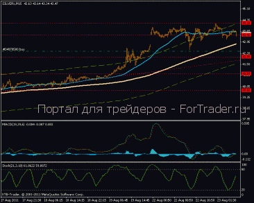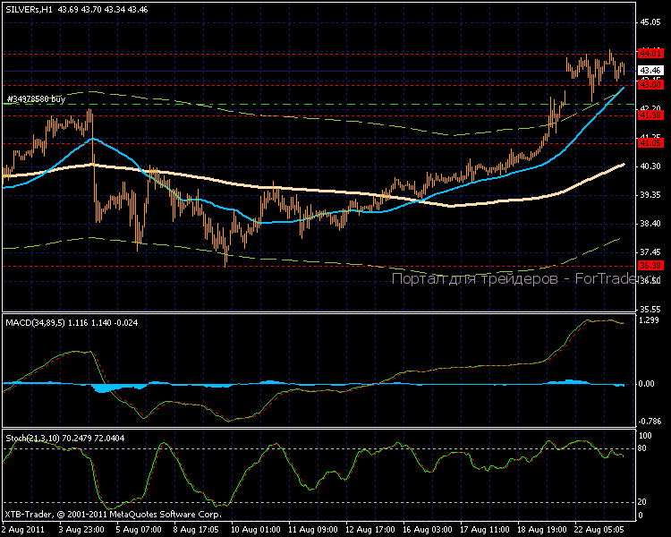 На часовом графике формирование восходящей тенденции, торги проходят выше 6-ти процентного канала, более быстрая МА пробивает его верхнюю границу. Индикатор MACD в положительной зоне показывает новые максимумы. На сегодняшний день важным уровнем поддержки выступает отметка 43,00 долл., сопротивление встречается по 44,00 долл. за тройскую унцию.