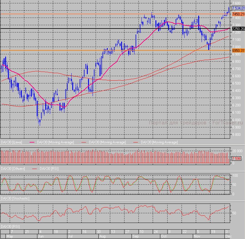 Индекс DAX мощно устремился вверх в первой половине дня и с 7450 пунктов вырос до 7550 пунктов, однако не смог удержать эту позицию. Сейчас индикатор пытается закрепиться выше 7520, однако все будет зависеть от итогов заседаний европейских центробанков.
