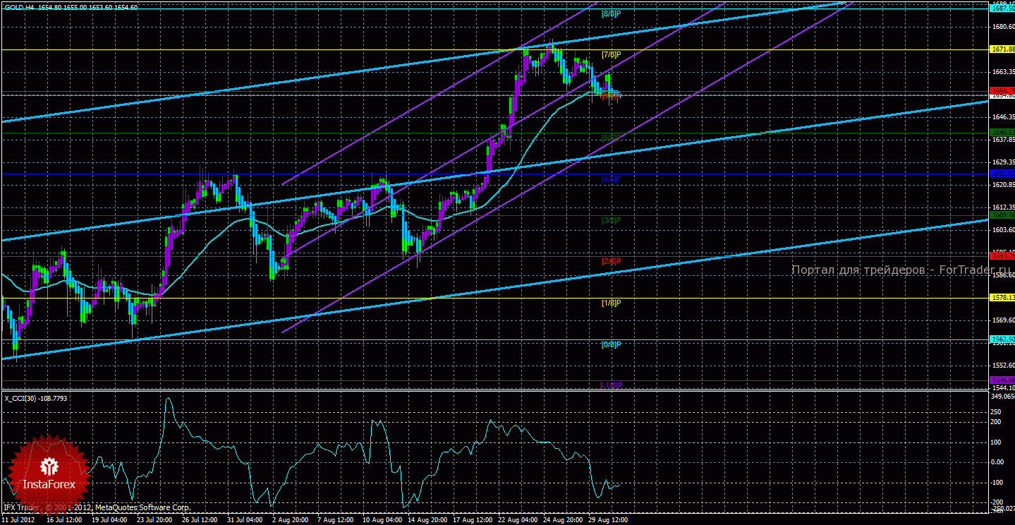 Исходя из картины, сложившейся по золоту 31 августа, видно, что инструмент закрепился ниже мувинга, закрепление это слабое, но дает возможность продолжить нисходящее движение. Старший канал направлен наверх, что свидетельствует о восходящем направлении движения глобального тренда. Младший канал также направлен наверх, что означает восходящее направление движения и в среднесрочном плане. На данный момент цена находится ниже мувинга и ниже уровня Мюррея «6/8», что говорит нам о нисходящем направлении движения в ближайшей перспективе. Первой целью нисходящего движения, таким образом, является уровень Мюррея «5/8» — 1640,63, однако, шорты еще рано рассматривать из-за направленности каналов наверх. В случае преодоления этого уровня следующей целью для нисходящего движения станет уровень Мюррея «4/8» — 1625,00. Скользящая средняя направлена вбок, а цена находится ниже нее, поэтому сейчас более вероятно нисходящее движение в ближайшие дни. Хайкен Аши окрасил последние бары в голубой цвет, что сигнализирует о текущем нисходящем движении, но шорты можно будет рассматривать все равно только после разворота канала линейной регрессии вниз. Короткие позиции станут вновь актуальными после разворота одного из каналов линейной регрессии вниз. Ордера на покупку будут актуальными после закрепления цены выше мувинга. Индикатор CCI находится около уровня -100, что говорит о небольшой перепроданности инструмента.