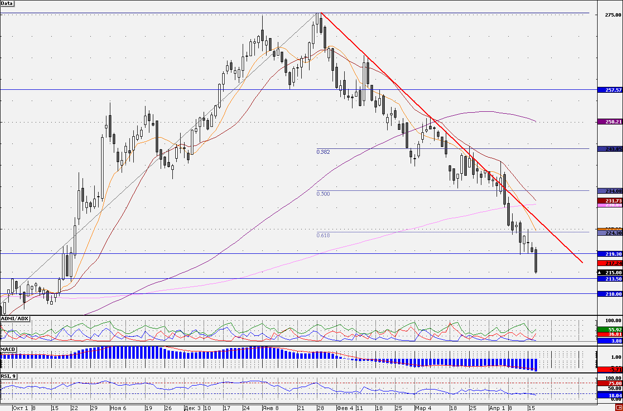 Несмотря на повышение рейтинга агентством S&P c «ВВВ-» до «ВВВ» акции «Роснефти» сегодня числятся среди лидеров падения. В первой половине дня бумаги обновили годовой минимум, пробив вниз отметку 219,30 руб., оказывающую поддержку в течение последних 4-х сессий. Сегодня поддержку бумагам может оказать уровень 213,50 руб., выступающий в качестве сопротивления с середины сентября и до середины октября прошлого года. При пробитии данного уровня далее целью выступит отметка 210 руб. Показания трендовых индикаторов пока могут свидетельствовать о сохранении негативной тенденции. Так индикатор ADMI/ADX показывает, что преимущество сохраняется на стороне продавцов (линия «медведей» находится выше линии «быков»), при этом график индикатора MACD (12;26;9) снижается на отрицательной территории. Таким образом, короткие позиции по бумагам пока более привлекательны, но при удержании коротких позиций также стоит быть осторожными в связи с сильной перепроданностью акций (график индикатора RSI(9) уже долгое время не может покинуть зоны перепроданности). Наш 30-минутный торговый робот находится в «шортах», удерживая короткие позиции от отметки 221,47 руб.