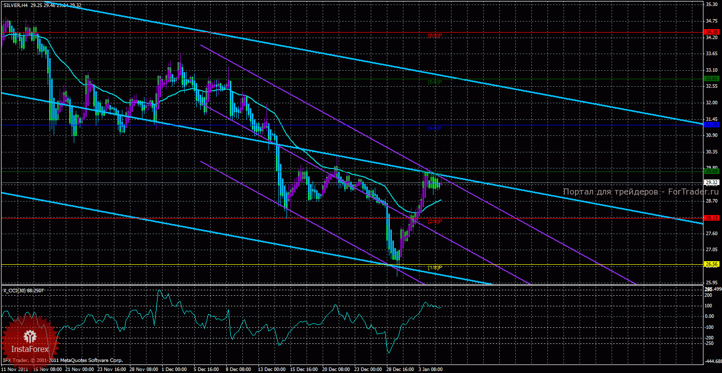 Исходя из анализа серебра 5 января видно, что серебро также поменяло направление движения и по нему сейчас также не рекомендуется торговать, так как оба канала направлены вниз. Старший канал направлен вниз, что свидетельствует о нисходящем направлении движения глобального тренда. Младший канал направлен вниз, что означает нисходящее движение в менее долгосрочном плане. Сейчас цена находится выше мувинга и выше уровня Мюррея «2/8», что делает актуальным восходящее движение. Первой целью восходящего движения является уровень Мюррея «3/8» — 29,69, но торговать на повышение не рекомендуется. В случае преодоления первого целевого уровня, восходящее движение продолжиться с целью «4/8» — 31,25. Скользящая средняя направлена вверх, а цена в свою очередь находится выше нее, что сигнализирует о текущем восходящем движении. Рассматривать торговлю на повышение можно будет не ранее разворота одного из каналов линейной регрессии наверх. Короткие же позиции можно будет рассматривать только после закрепления цены ниже мувинга. Хайкен Аши окрасил несколько баров в голубой цвет, что сигнализирует о локальном нисходящем движении, что не позволяет сейчас открывать лонги, в целом длинные позиции также сейчас не актуальны. Индикатор CCI находится около уровня 100, что свидетельствует о небольшой перекупленности курса серебра.