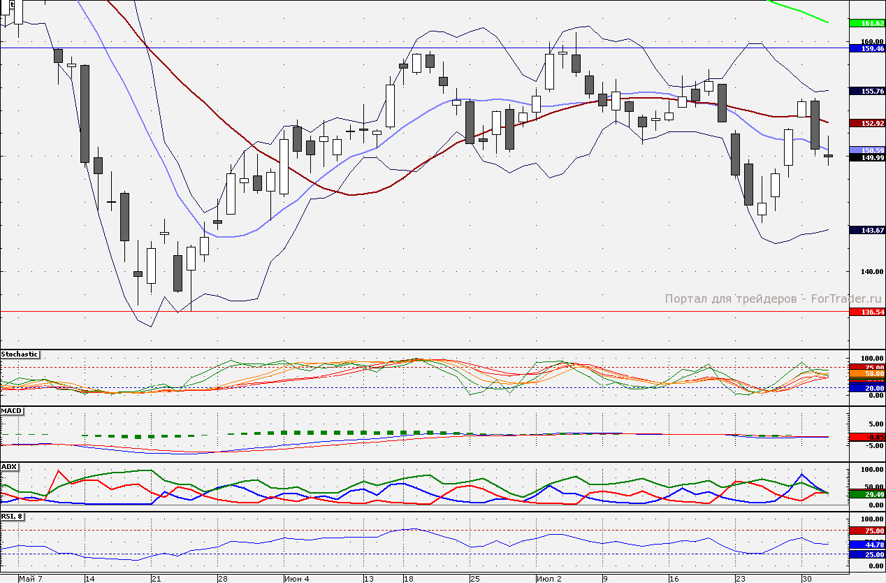 Акции «Газпрома» консолидировались вблизи 150 руб., торги сегодня могут вновь проходить вблизи данной отметки. Сопротивлением является 21-дневная скользящая средняя – около 153,0 руб. Поддержкой является лишь 145 руб.