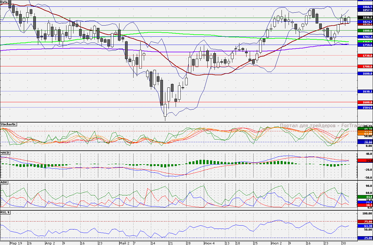 Ближайшие уровни сопротивления: 1850,00/1865,00