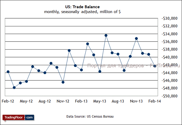 Если ожидания в отношении европейской экономики оправдаются, то это пойдет на пользу американскому экспорту. Согласно прогнозам, некоторые признаки улучшения на этом фронте мы увидим в сегодняшнем отчете из Вашингтона за март. Консенсус-прогноз предусматривает незначительное снижение торгового дефицита в конце первого квартала до 40,5 млрд долларов по сравнению с февральским значением на уровне 42,3 млрд.