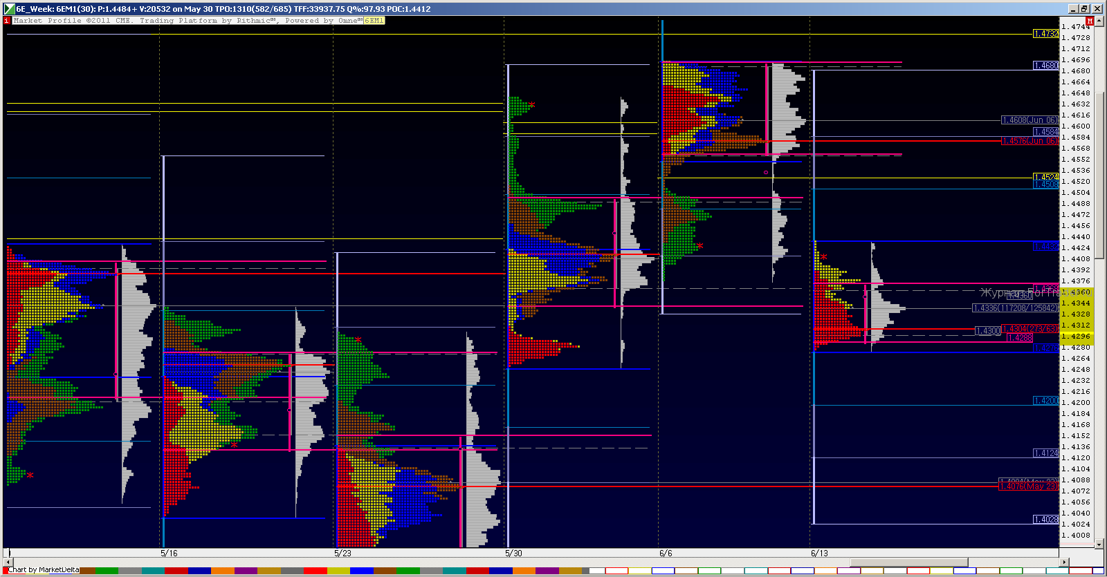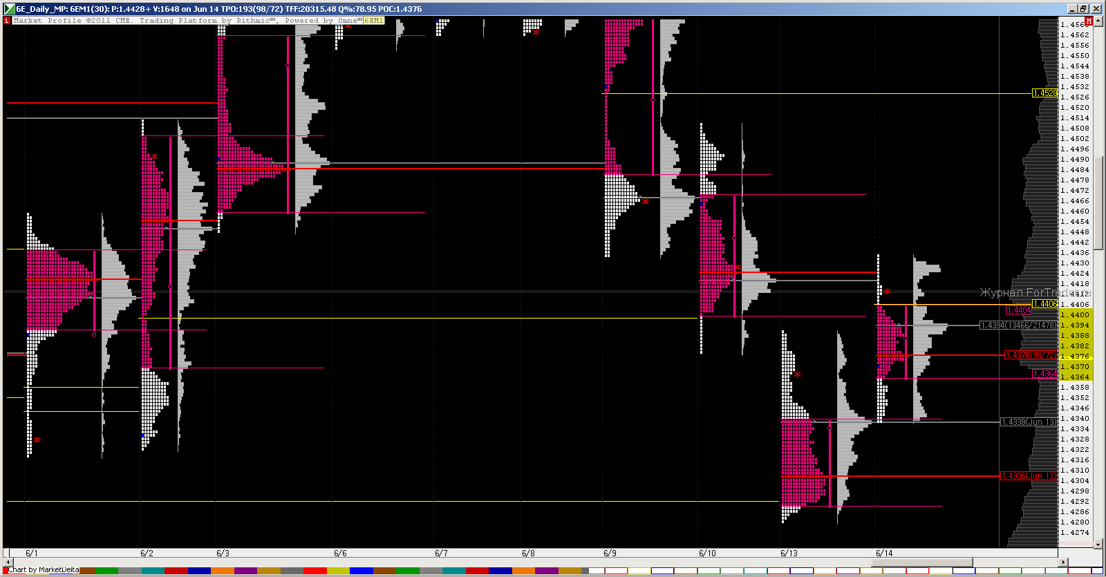 Закончилось действие старого июньского контракта 6ЕМ1, начинам смотреть на новый сентябрьский 6EU1. Связанные с этим неудобства в виде календарного спреда придется учитывать тем кто торгует спот форекс. Сегодня спред на форекс +20 пунктов. Соответственно к сетапам в плане +20 получаем сетапы на форекс. Открытие недели прошло по медьвежьи. Открытие дня по бычьи в конкретном дисбалансе. На открытии европейской сесии сделали пробой наверх первого часа и закрыли NPOC -1.4422 от 10.06. Сделали также расширение в 261.8% от первого часа до 1.4434 и до 89 мувинга на часовиках. С точки зрения свинга внутри недели имеем потенциал закрыть дырку образовавшуюся на прошлой неделе на 1.4524, но это наверно уже завтра. Однако сначала надо пробить недельный пивот WPP, а это с первого раза не так просто обычно, в добавок S1 на этом же уровне. Суммируя вышесказанное, трейды от продаж пока как то больше внушают. В любом случае пока не сформируется первичный баланс недели говорить о позиционной торговле не стоит, торгуем скальпы +10, +20 Удачных всем трейдов!!!