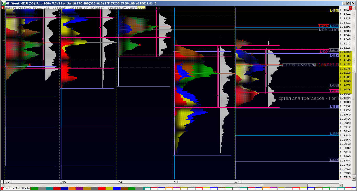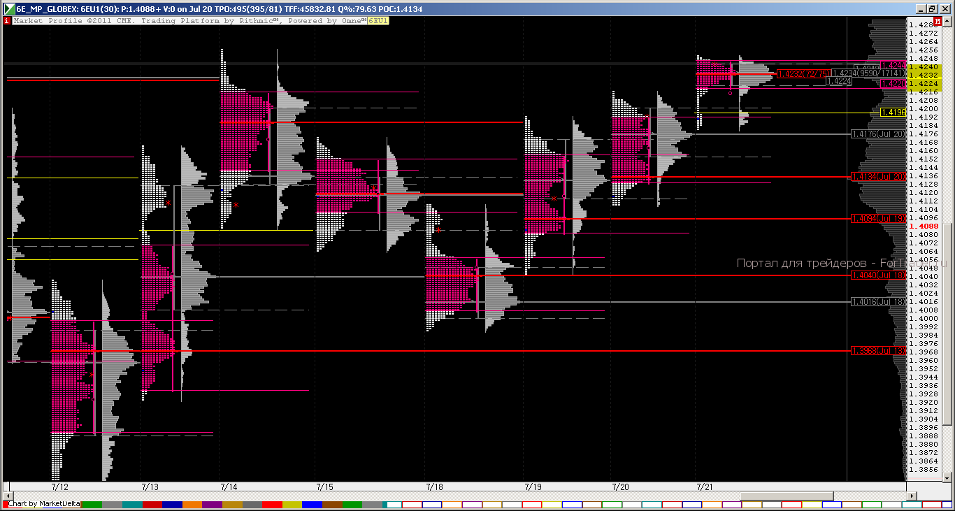 Евросоюз собирается на саммит, Бернанке выступает с докладами, трейдеры торгуют… все заняты своим делом. Ликвидность чуть ниже среднего зато большой новостной блок в 16-30 и 18-00 мск должны обеспечить достойную волатильность. В текущием моменте рынок продолжает пробой на север начавшийся на прошлой неделе, и протестировав недельный VAL на 1.3988 вчера также пробил недельный IBH Week 1.4192 и закрепился выше этого уровня. Что характерно , что дневные РОС последних дней повышаются и даже не перекрываются, подтверждая планомерное повышение цены. Открытие Европы состоитсся в дисбалансе с бычьим уклоном поэтому все откаты сегодня можно расценивать как повод для покупок.Удачных всем трейдов!!!