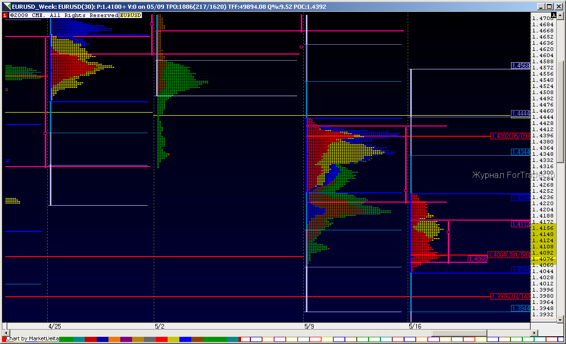 А пока то ли доллар укрепляется, то ли евро падает, но котировки вторую неделю все еще не вышли из даун тренда. На очереди четвертый заход на тест МА89(1Н)-1.4189. Статистически вероятность пробоя высокая, однако если это случится еще до начала европейской сессии, то скорее всего он не получит развития, а рынок снова спустится к границе 1.4056 (VAL). В случае пробоя будем смотреть как котировки себя поведут на границе 1.4207-1.4224. Эта зона выступит своеобразным bull\bear текущей недели. В целом же рынок все еще больше склонен медленно сползать вниз, позиции трейдеров по евро long\short, остаются нейтральными без явного перевеса одной из сторон. На текущий момент , после открытия европейской сессии по фьючерсу на евро тоже полное спокойствие, слабые покупки и полнейшее отсутствие объемов. Выжидать, пока одна из сторон явно не заявит о своих намерениях, и только тогда играть на стороне сильного игрока и не важно в какую сторону.