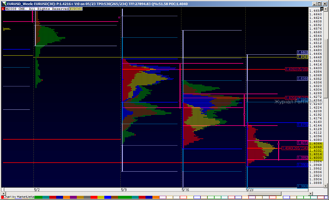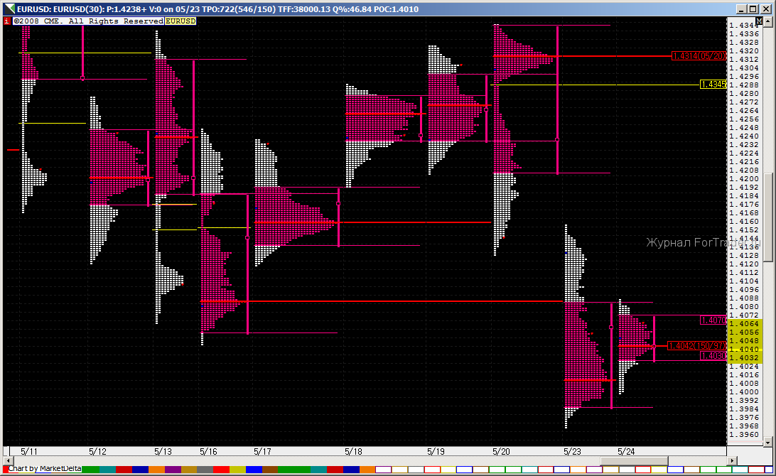 В Европе проблемы с долгами… как страшно… национальную валюту сливают…котировки упали под лои двухмесячной давности… Видимо у доллара все хорошо, возникает резонный вопрос. Но тут, благодаря одному известному блогу на глаза попадается заметка в Associated Press[22.06] о том, что в штате Utah, золотые и серебрянные монеты официально признаны расчетной валютой. Нормально! В доллар уже не верят даже на родине. Очень похоже на начало конца. Темы дефолта всплывают все чаще, станок молотит в три смены…На открытии европейской сесии, евро сидит в шумовой ценовой зоне на дневном пивоте и внутри зоны VA вчерашнего дня. Пока такое равновесие сохраняется скальпы от границ 1.4082-1.3986 будут вполне уместны. В целом евро вчера проколол MA89(D), и повис на нем, и пока рынок под него не провалится будем считать все текущее снижение коррекцией к росту. Сегодняшний день видится внутри диапазона 1.4184-1.4206 сверху и 1.3986 снизу. Вверху фанера из сопротивлений, внизу все продали кто хотели. Дотянулись таки до мартовского NPOC(W). Что касается дальнейшего снижения евро, то сначала неплохо было бы снять позиционные стопы на уровнях >1.4344 и >1.4448, на них примерно приходятся уровни коррекции от текущего падения. Фондовые индексы сегодня скорее всего тоже будут отскакивать после вчерашнего падения, серьезных новостей вроде бы тоже не предвидится. Удачных всем трейдов!!