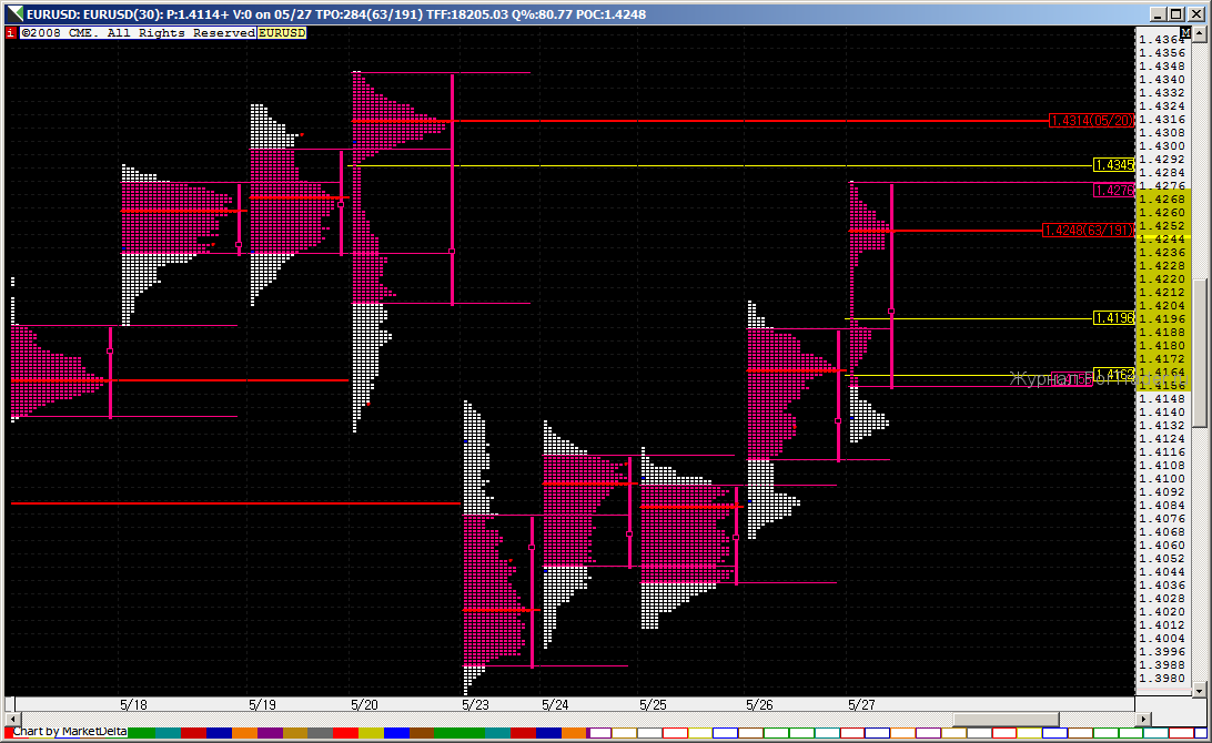 Доллар на америанской сессии вчера отвалился, потому что спрос на 10-летки упал и доходности по ним подскочили до 6 месячного уровня. Китайцы не ходят кредитовать по дешевке…а МВФ скоро заткнет все европейские бюджетные дыры, если евросоюзу удастся протащить на пост распорядителя своего человека и не пустить в правление ни представителей кидая , ни БРИК… «, примерно так объясняют резкое движение евро финансовые издания. А между тем правительство штатов в срочном порядке изыскивает новые источники финансирования своего бюджета. SEC проголосовала за новые правила поощрения корпоративных стукачей. Теперь от 10 до 30% может достаться новоявленному «Полу Морозоффу» на гамбургеры, если он сможет слить в госоганы инсайд о подозрительных корпоративных делишках своих работадателей. Европа сегодня открылась по вчерашнему сценарию, с хорошим гэпом. Азиаты оставили зоны быстрого движения с Single Prints на уровнях 1.4162 и 1.4196. Первая цель скорее всего будет закрыта и это будет консервативный лонг. Цель пятницы- дотянуться до 1.4300 и снять NPOC-1.4314 и возможно протестировать хаи 20.05…Это было бы логично и по типу сегодняшнего подвижного дня , и по статистическим целям. Раз уж пошли, какой смысл останавливаться на пол пути. Заходить лонг позиционно на текущих уровнях тоже как то опасливо, не дождавшись отката аналогичного вчерашнему. Заходить лонг на моментуме на подлете к важному уровню допустимо, пунктов 20-30 ухватить можно. Удачных всем трейдов!!!