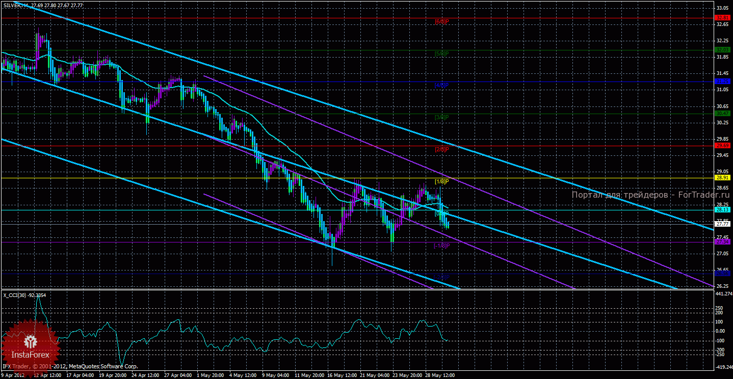 Исходя из анализа серебра 30 мая, видно, что цена вновь закрепилась ниже скользящей средней, что позволяет торговать на понижение, выше мувинга цена провела немного времени. Старший канал направлен вниз, что свидетельствует о нисходящем направлении движения глобального тренда. Младший канал направлен вниз, что означает нисходящее движение и в менее долгосрочном плане. На данный момент цена находится ниже мувинга и ниже уровня Мюррея «0/8», что делает более вероятным продолжение нисходящего движения. Первой целью нисходящего движения является уровень Мюррея «-1/8» — 27,34, этот уровень уже был 2 раза отработан ценой. Если курс серебра сумеет закрепиться ниже этого уровня, то продажи можно будет продолжать с целью «-2/8» — 26,56. По достижении и преодолении этого уровня все уровни Мюррея перерисуются и будут образованы новые уровни. Скользящая средняя направлена вниз, а цена в свою очередь находится ниже нее, что сигнализирует о текущем нисходящем направлении движения. Длинные позиции будут вновь актуальны только после закрепления курса выше мувинга и разворота одного из каналов регрессии наверх. Хайкен Аши окрасил последние бары в голубой цвет, что сигнализирует о локальном нисходящем движении, поэтому сейчас можно рассматривать ордера на продажу до тех пор, пока Хайкен Аши направлен вниз. Индикатор CCI находится около уровня -100, что свидетельствует о слабой перепроданности инструмента.