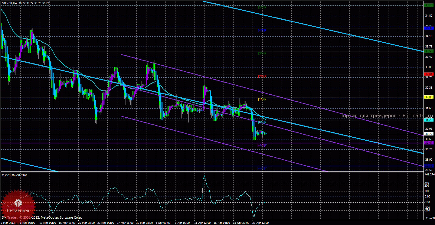 Исходя из анализа серебра 25 апреля, видно, что нисходящее движение усилилось, этот факт вновь позволяет нам в полной мере рассматривать короткие позиции, все индикаторы указывают на нисходящее движение. Старший канал направлен вниз, что свидетельствует о нисходящем направлении движения глобального тренда. Младший канал направлен вниз, что означает нисходящее движение в менее долгосрочном плане. Сейчас цена находится ниже мувинга и ниже уровня Мюррея «0/8», что делает более вероятным продолжение нисходящего движения. Первой целью нисходящего движения является уровень Мюррея «-1/8» — 30,47, который уже был достигнут, но не преодолен. В случае преодоления первого целевого уровня, нисходящее движение может продолжиться с целью «-2/8» — 29,69. В случае достижения уровня «-2/8», все уровни Мюррея перерасчитаются и мы получим новые цели для торговли. Скользящая средняя направлена вниз, а цена в свою очередь находится ниже нее, что сигнализирует о текущем нисходящем направлении движения. Длинные позиции будут вновь актуальны только после закрепления курса выше мувинга и разворота одного из каналов регрессии наверх. Хайкен Аши окрасил последние бары в голубой цвет, что сигнализирует о локальном нисходящем движении, поэтому сейчас можно открывать и поддерживать ордера на продажу. Индикатор CCI находится около уровня -100, что свидетельствует о слабой перепроданности инструмента.