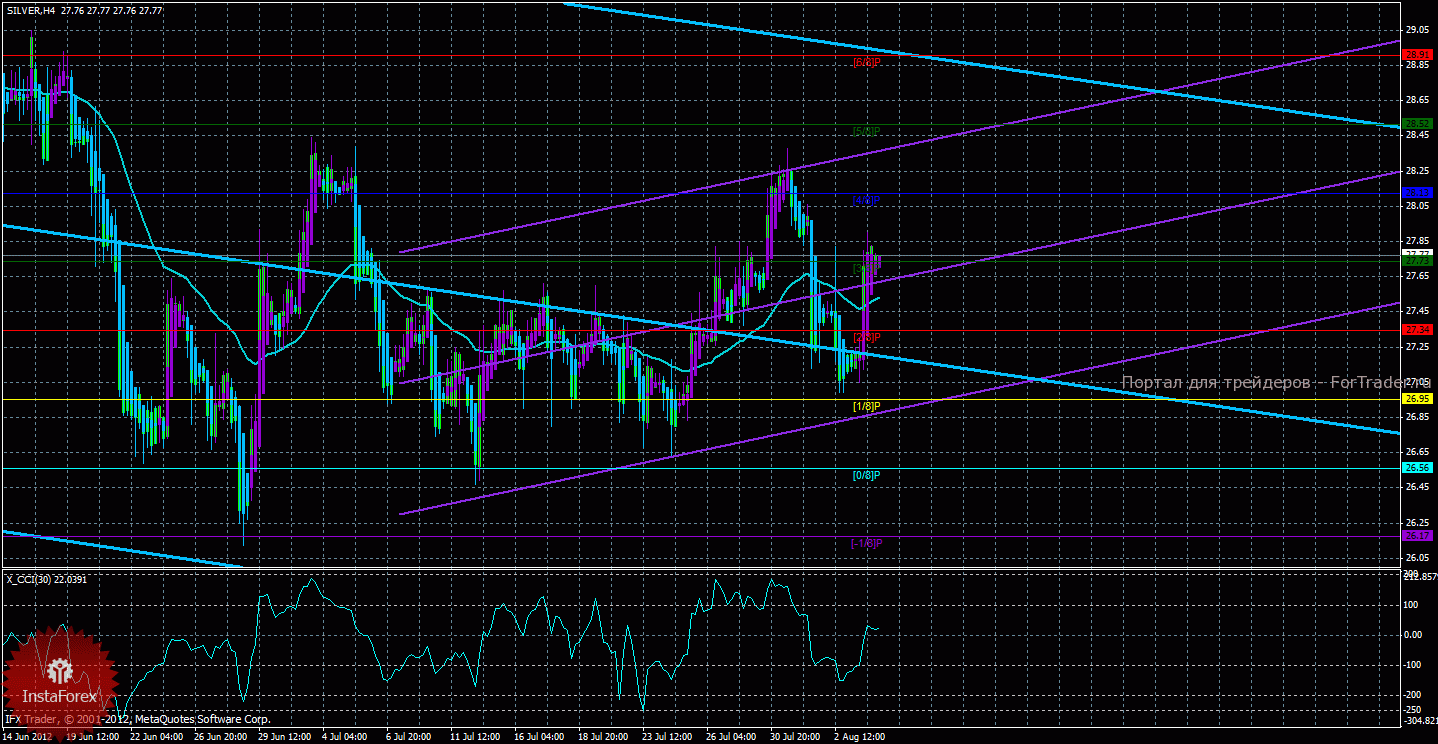 Исходя из анализа серебра 6 августа, видно, что цена с параллельно с золотом закрепилась выше скользящей средней, что теперь также позволяет рассматривать лонги по серебру. Старший канал направлен вниз, что свидетельствует о нисходящем направлении движения глобального тренда. Младший канал развернулся наверх, что означает восходящее движение в менее долгосрочном плане. Сейчас цена находится выше мувинга и выше уровня Мюррея «3/8», что делает более вероятным продолжение восходящего движения. Первой целью восходящего движения является уровень Мюррея «4/8» — 28,13. Если курс серебра сумеет закрепиться выше этого уровня, то восходящее движение может продолжиться с целью «5/8» — 28,52. Скользящая средняя направлена вверх, а цена в свою очередь находится выше нее, что сигнализирует о текущем восходящем направлении движения. Короткие позиции можно вновь рассматривать, если цена закрепиться ниже мувинга. Хайкен Аши окрасил последние бары в фиолетовый цвет, что сигнализирует о локальном восходящем движении, значит пока что ордера на покупку актуальны, а разворот этого индикатора вниз обозначит начало коррекции. Индикатор CCI находится около уровня 0, что свидетельствует об отсутствии любой перекупленности или перепроданности инструмента.