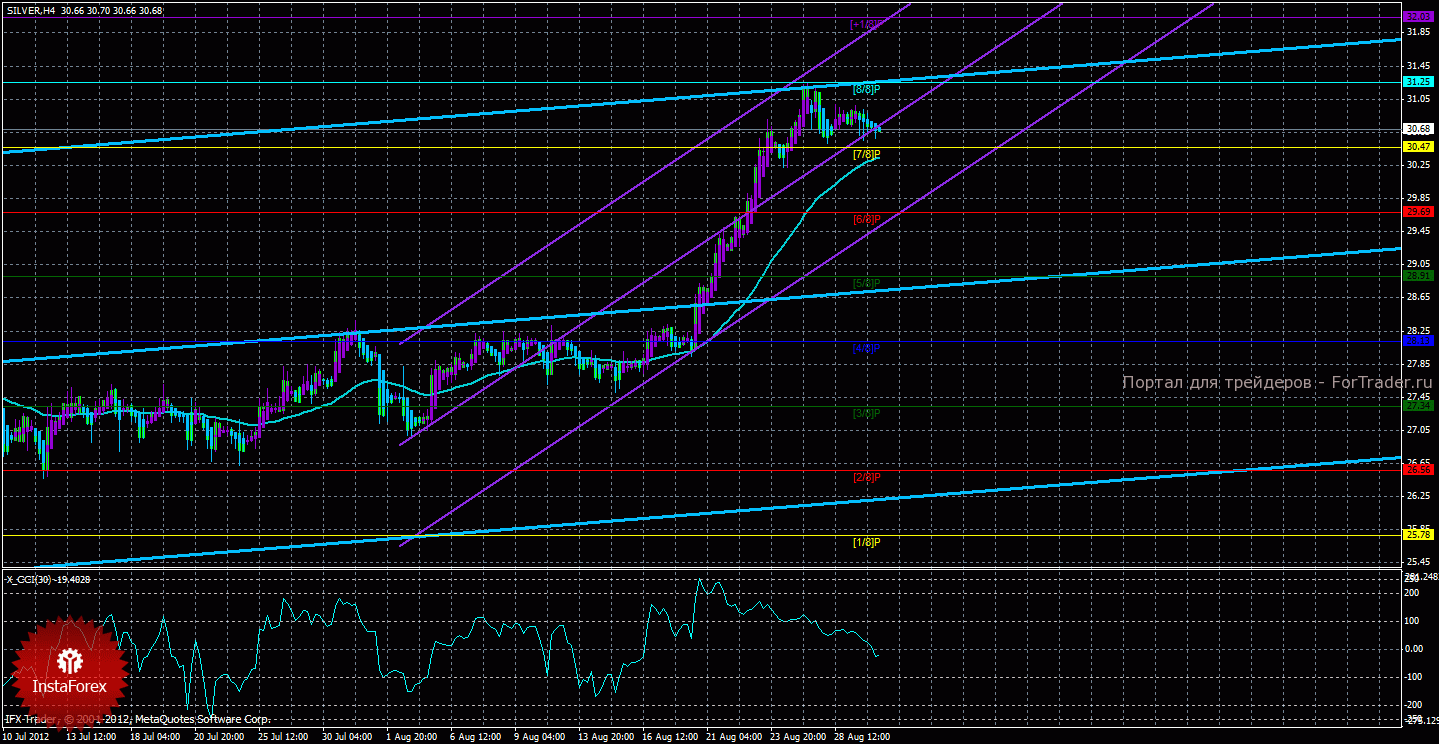 Исходя из анализа серебра 30 августа, видно, что инструмент сохраняет перспективы продолжения восходящего движения, но в очередной раз корректируется. Старший канал развернулся наверх, что свидетельствует о восходящем направлении движения глобального тренда. Младший канал направлен наверх, что означает восходящее движение в менее долгосрочном плане. Сейчас цена находится выше мувинга и выше уровня Мюррея «7/8», что делает более вероятным продолжение восходящего движения. Первой целью восходящего движения является уровень Мюррея «8/8» — 31,25. В случае преодоления ценой этой отметки, следующей целью для продолжения восходящего движения будет выступать уровень Мюррея «+1/8» — 32,03. Скользящая средняя направлена вверх, а цена в свою очередь находится выше нее, что сигнализирует о текущем восходящем направлении движения. Короткие позиции можно будет вновь рассматривать, если цена закрепиться ниже мувинга и развернется вниз один из каналов линейной регрессии. Хайкен Аши окрасил последние бары в голубой цвет, что сигнализирует о локальном нисходящем движении, а значит, что ордера на покупку будут вновь актуальны после образования 1-2 фиолетовых баров. Индикатор CCI находится около уровня 0, что свидетельствует об отсутствии как перекупленности, так и перепроданности инструмента.