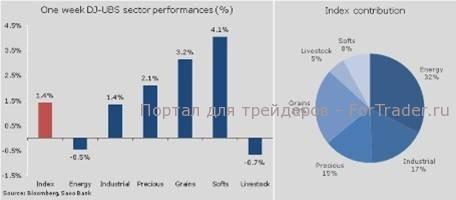 Основным поводом для роста цен послужили погодные условия: заморозки в Северной Америке и засуха в Южной Америке оказали особую поддержку кофе сорта Арабика и пшенице, торгующейся на Чикагской товарной бирже. В результате в сельскохозяйственном секторе впервые с начала декабря возобновилась положительная динамика, как можно видеть на графике сельскохозяйственного индекса DJ-UBS.