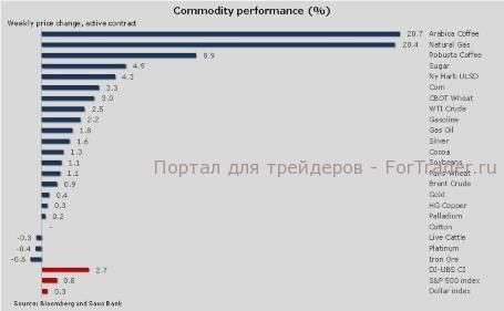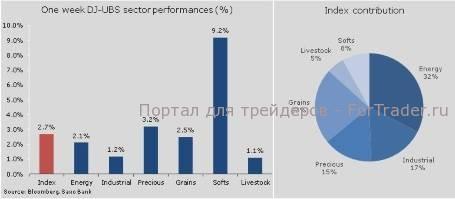 Положительная динамика наблюдается во всех секторах, прежде всего на сельскохозяйственном рынке, где бал правят кофе и сахар, а также в сегменте драгоценных металлов. Зависящие от экономического роста товары, такие как энергоресурсы и промышленные металлы, также демонстрировали положительную доходность, однако здесь негативное влияние оказала новость об очередном снижении индикатора уверенности в производственном секторе Китая до семимесячного минимума.