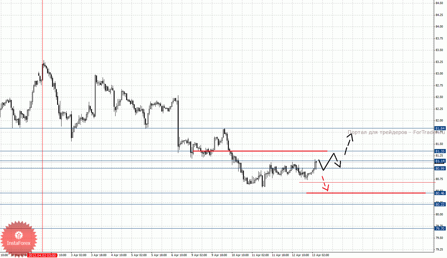 По паре Доллар/Йена ключевыми уровнями являются: 81.84, 81.35, 81.14, 80.46, 80.22 и 79.70. Здесь основные цели пока остаются без изменения, оформления начальных условий для восходящего движения ожидаем после пробоя 81.35. В коридоре 80.46 – 80.22 ожидаем краткосрочное движение книзу, а также консолидацию. Пробой уровня 80.22 позволит рассчитывать на движение к 79.70, по достижении этого уровня ожидаем откат кверху. Краткосрочное восходящее движение ожидаем в диапазоне 81.14 – 81.35, пробой последнего значения будет располагать к развитию восходящей структуры, в данном случае потенциальная цель 81.84.