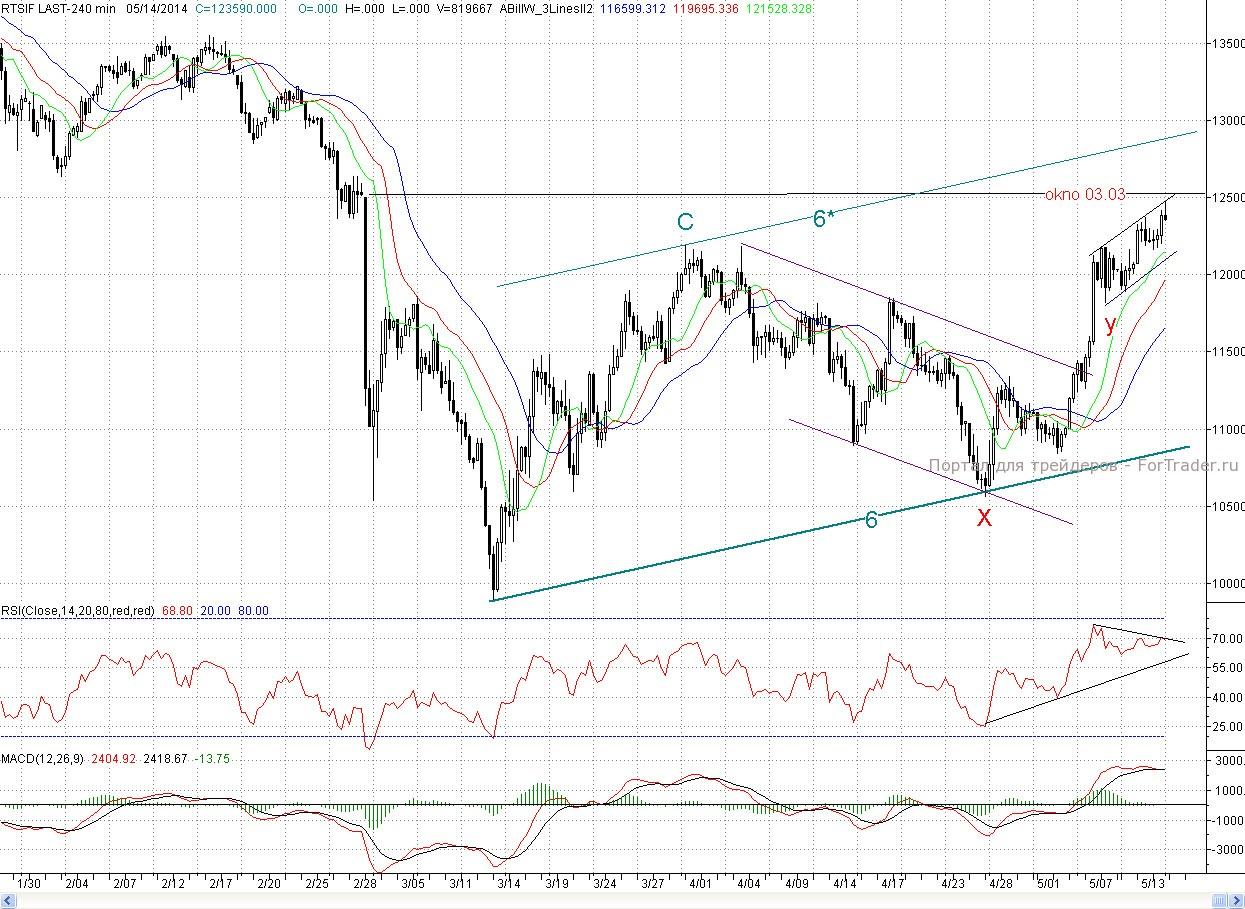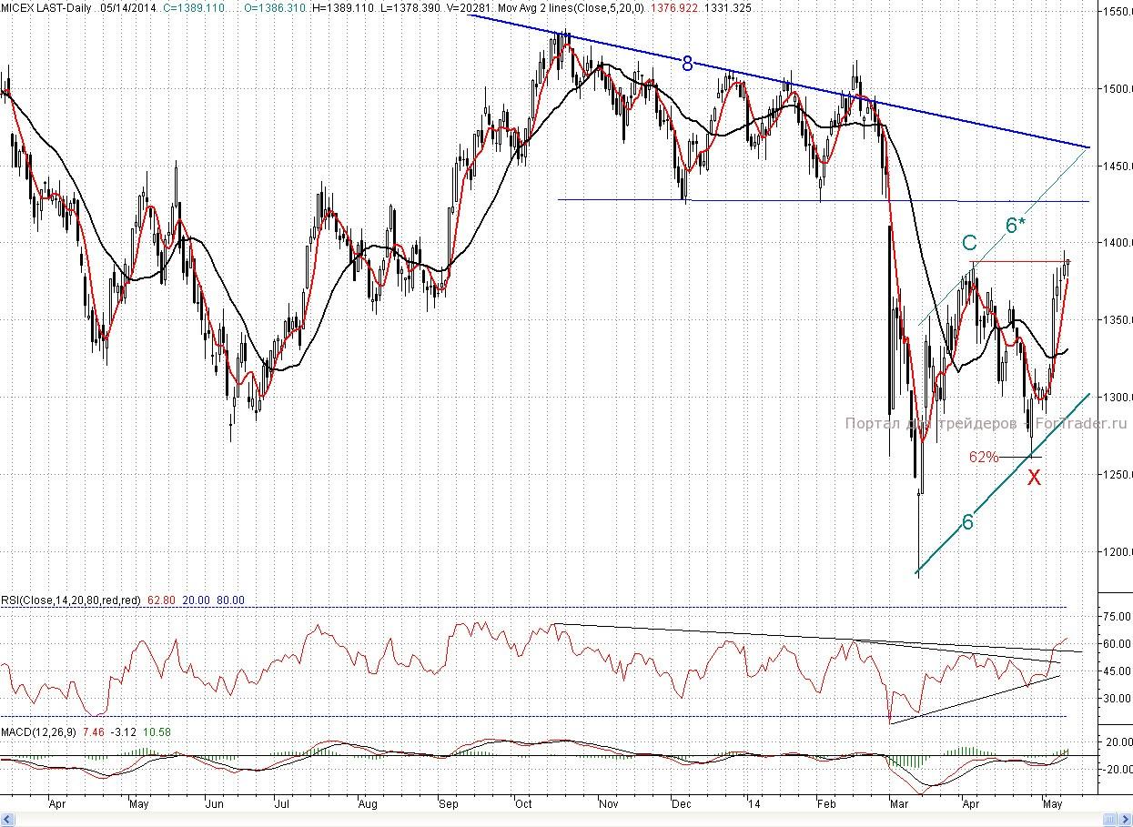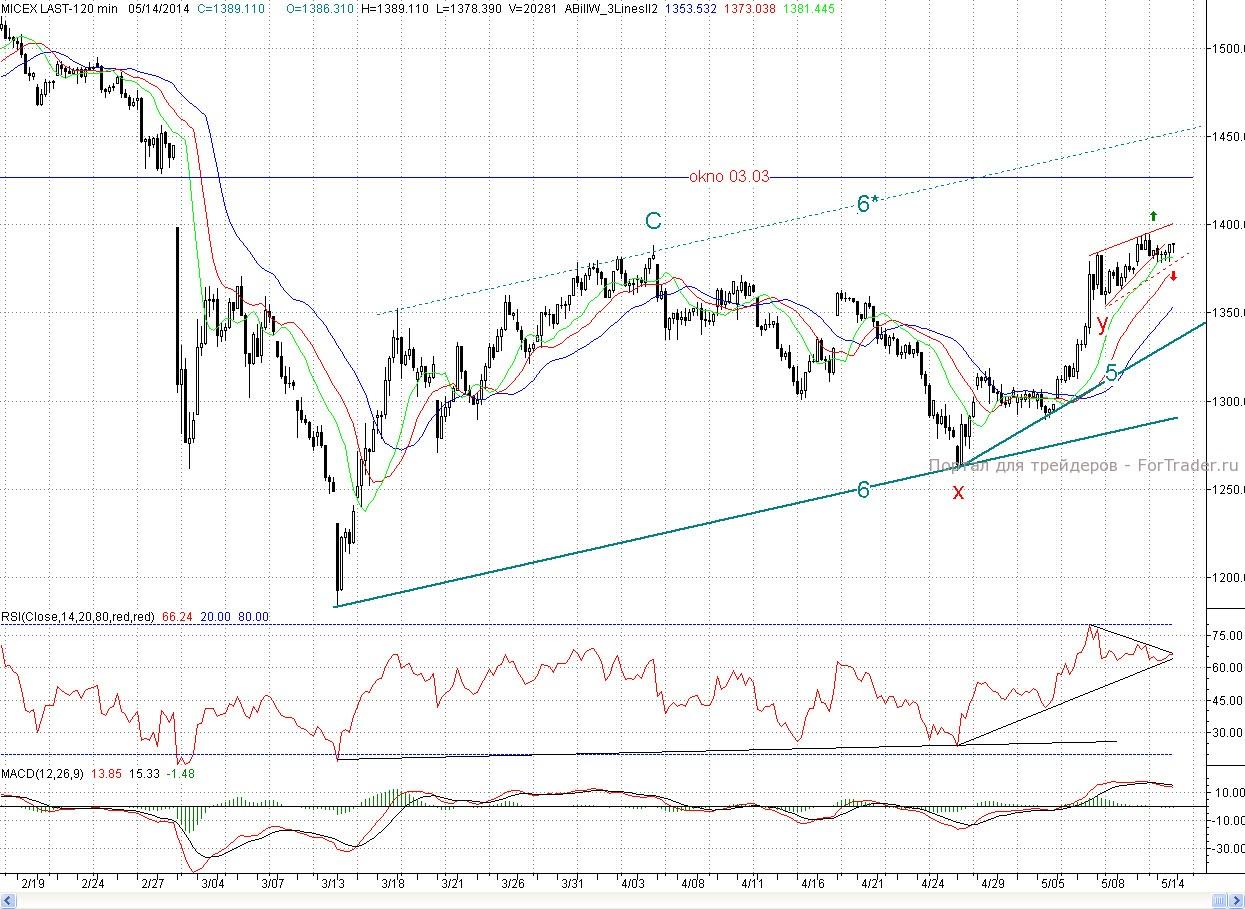 Тем не менее, с технической точки зрения плюсом для покупателей является то, что на 2- часовом графике вырисовывающийся трехдневный клин не подтвердился, и индекс ММВБ по Б. Уильямсу по прежнему находится в покупке. А наблюдаемые медвежьи дивергенции почти отработались. На дневном графике комбинация из 3 крайних свечей показывает о нежелании цен корректироваться, а это уже говорит в пользу быков. К тому же после пересечения снизу вверх быстрой средней скользящей МА (5) медленной МА (20), последняя также развернулась вверх. И в случае уверенного преодоления максимума вторника (1 395,19 п.) котировки с большой вероятностью закроют широкое окно от 3 марта (1 410 –1 444 п.). А вот индекс РТС и соответственно фьючерс на него это почти уже сделали. Так что здесь более логичным выглядит снижение, как минимум с целью разгрузить индикаторы, показывающие медвежьи дивергенции, и с последующим ростом в район 130 000 п. (верхняя граница среднесрочного растущего канала (6-6*))