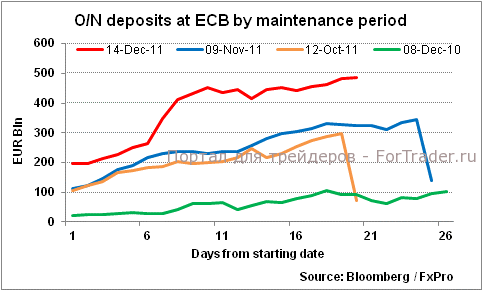 Все более очевидна неэффективность политических инструментов ЕЦБ, так как кредитный кризис в еврозоне случился из-за ряда факторов. Дальнейшее трехлетнее обеспечение ликвидностью привело к тому, что существенная часть средств вернулась обратно через краткосрочные депозиты (см. график), которые в данный момент составляют чуть более 1% от ВВП еврозоны. Главные проблемы банков в погашении долгов и соответствии требованиям к капиталу от EBA. Все это здорово, но это снижает кредитование бизнеса и домохозяйств, что хорошо для тех, кому нужен делевередж, и плохо для хороших кредитов. Кредитный обзор ЕЦБ этого месяца, скорее всего, будет иметь неблагоприятный тон, наблюдавшийся и в октябрьском отчете, когда банки ужесточали условия кредитования на фоне ухудшения условий на оптовых рынках и ухудшения экономической ситуации (и то и другое стало еще печальней с тех пор).