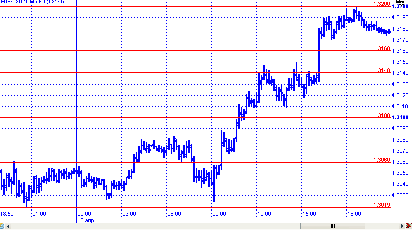 Пара евро/доллар все же смогла вырваться из диапазона, в котором консолидировалась в течение нескольких дней. Котировки довольно быстро нацелились на тестирование уровня 1,31, который с легкостью смогли преодолеть. Прошла пара и уровень 1,3140. Максимум был отмечен на 1,32, который и сдержал дальнейшее движение вверх. К завершению дня пара откатилась к 1,3180.