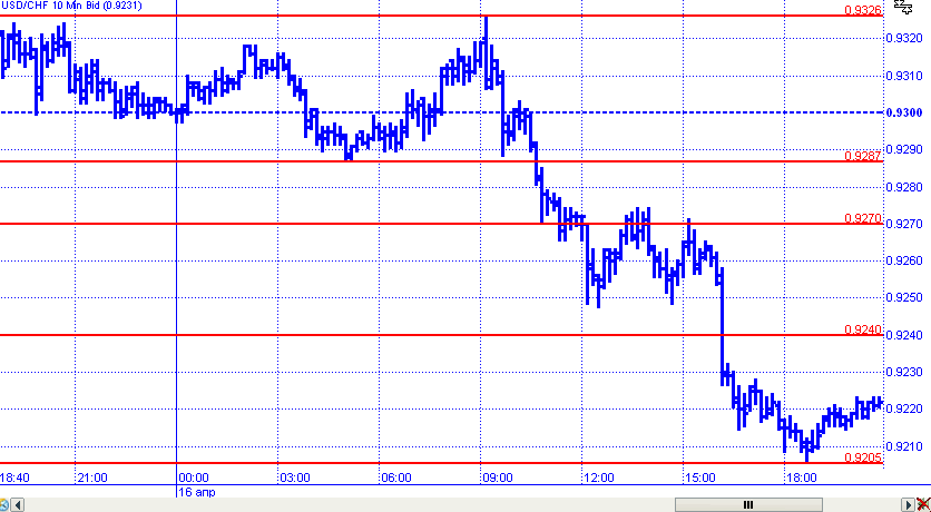 Пара доллар/франк в первой половине торговых суток вторника удерживалась в пределах диапазона 0,9287 – 0,9326. В дальнейшем цены смогли преодолеть его нижнюю границу. Прошли еще несколько уровней поддержки и отметили минимум на 0,9205. Однако к завершению дня пара откатилась к отметке 0,9220.