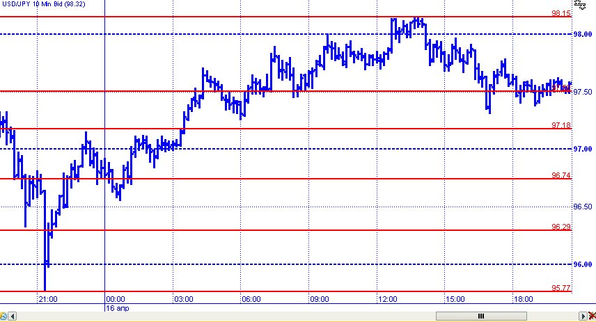 Пара доллар/иена во вторник смогла восстановить часть потерь, понесенных ранее. Котировки от минимума на уровне 95,77 начали движение вверх, преодолели несколько уровней сопротивления и попытались закрепиться выше уровня 98.00, отметив локальный максимум на 98,15. Однако, к завершению дня пара все же вернулась в поддержке 97,50.