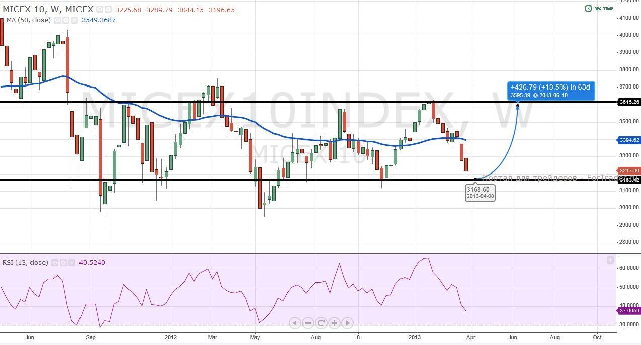 Кипрские событися усугубляют настрой инвесторов покупать наши активы. Как правило, российский рынок реагирует на внешний позитив и растет вместе с американскими, азиатскими и европейскими площадками. Сейчас же, в моменты их роста российские индексы либо стоят на месте либо прибавляют десятые доли процента. В то время как падение отигрывается с удвоенной силой. Техническая картина по индексу ММВБ 10 предпологает отскок от ближайшей линии поддержки на отметке 3163 пункта, что может явиться началом сильного роста до верхних границ широкого диапазона (3163-3615). В то же время, необходимо фильтрвать вход индикатором RSI. Смутить покупателей могут большие объемы при движении вниз, так что уровень поддержки может и не удержаться. Спасает ситуацию обязательное выставление защитных ордеров.