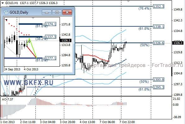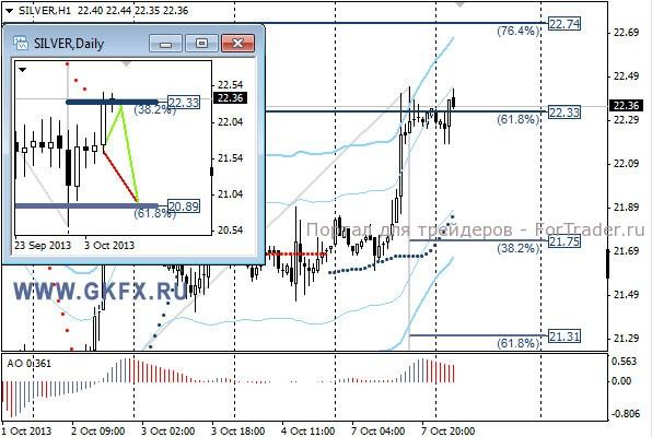 Цены на золото вплотную приблизились к уровню 1326,00. Это говорит о том, что участники рынка уже начинают нервничать из-за ситуации в США с грозящем дефолтом. Возможно, по этой причине золото начинает попытки укрепляться. На валютном рынке затишье после бурной пятницы и это тоже стало фактором за рост золота. Традиционно делаю два варианта движения цены на неделю, основной красный и альтернативный зеленый. Значимые уровни на сегодня отмечены на часовом графике. Индикатор АО находится в положительной зоне и растет, указывая на желание инструмента идти вверх в данное время. Индикатор тренда указывает на рост. Преодоление уровня 1326,00 даст возможность совершить покупки с целями 1337,0 и 1352,0.