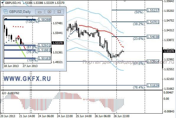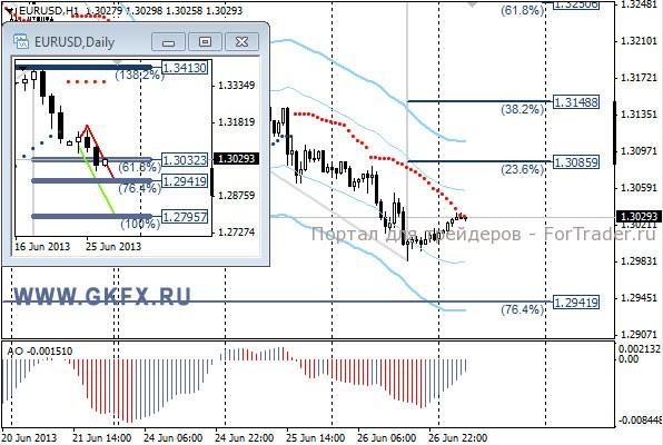Пара EURUSD продолжила снижение, несмотря на пересмотр ВВП США в худшую сторону. Это говорит о нежелании направлять пару вверх участниками рынка, хотя такая возможность была. Если посмотреть на дневной график, то видно, что отрабатывает красный вариант и цель снижения пары как минимум 1,2940. Поддержка 1,3030 была пройдена сегодня ночью и дорога к 1,2940 или ниже открыта. На эту неделю традиционно рассматриваю два варианта возможного движения цены, основной красный и альтернативный зеленый. Значимые уровни на сегодня отмечены на часовом графике. Индикатор АО находится в отрицательной зоне и растет, указывая на коррекцию перед возможным продолжением снижения. Индикатор тренда указывает на снижение. Продажи от 1,3030 с целью 1,2945.