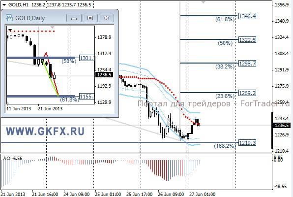 Цены на золото вчера практически выполнили цель 1219,0 немного не дойдя.  Сейчас можно ожидать коррекции от этого снижения. На дневном графике я нарисовал уж совсем пессимистичный сценарий, но неделя еще не закончилась и он может воплотиться в жизнь. Цене нужно будет сделать подобный рывок как вчера и очередная цель в районе 1160,0 будет достигнута. Традиционно делаю два варианта движения цены на неделю, основной красный и альтернативный зеленый. Значимые уровни на сегодня отмечены на часовом графике. Индикатор АО находится в отрицательной зоне и растет, указывая на коррекцию перед возможным продолжением снижения. Индикатор тренда указывает на снижение. Сегодня можно поработать в коррекции, продать от 1247,0 или 1255,0, зависит от того, где цена застопорится.