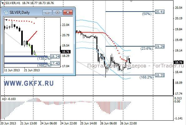 Цены на серебро вчера доходили до минимумов с августа 2010 года. Ситуация соответствует золоту. Традиционно делаю два варианта движения цены на неделю, основной красный и альтернативный зеленый. Значимые уровни на сегодня отмечены на часовом графике. Индикатор АО находится в отрицательной зоне и растет, указывая на коррекцию перед возможным продолжением снижения. Индикатор тренда указывает на снижение. Сегодня можно поработать в коррекции, продать от 19,00 или 19,40, зависит от того, где цена застопорится.